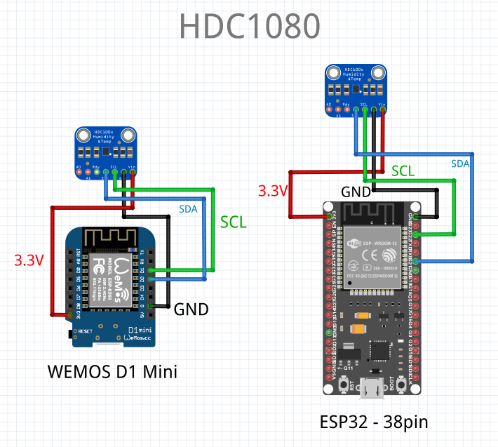 - HDC1080 - HDC1080 (HTU21D\SHT21) Это датчик влажности воздуха и температуры с интерфейсом подключения I2C от компании Texas Instruments.