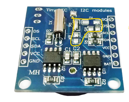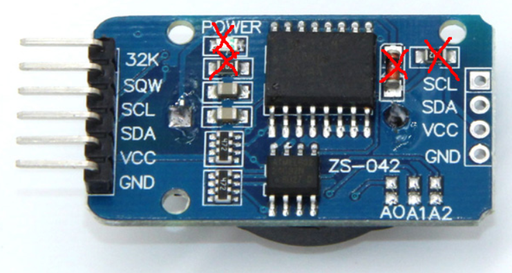 Модуль часов реального времени рассчитан на установку аккумулятора или ионистора, в качестве источника аварийного питания. В модуле предусмотрена цепочка для их заряда. Если вместо аккумулятора воткнуть простую батарейку (типоразмер CR2032), то она может раздуться и перестать работать или вообще загореться. В модуле нужно исключить цепь заряда. Ещё можно исключить светодиод по питанию и его токоограничивающий резистор.