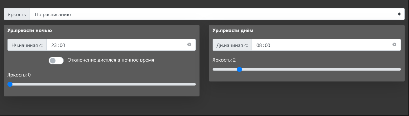 По расписанию - регулировка яркости по расписанию имеет 2 опции регулировки: Дневная и ночная яркость