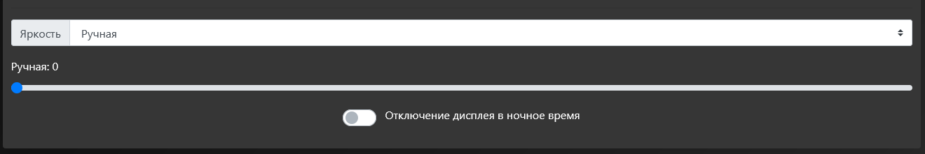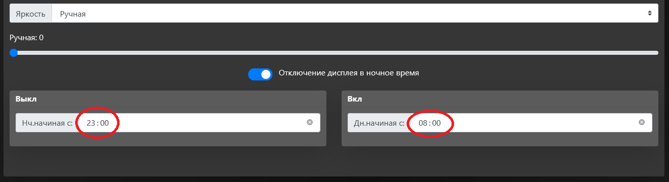 Первая настройка времени начала ночной яркости с ползунком уровня яркости ночью.