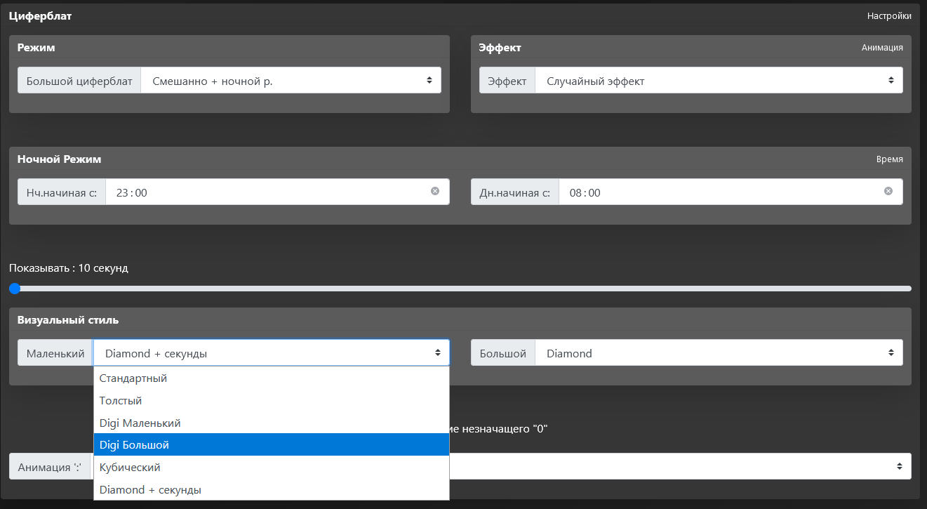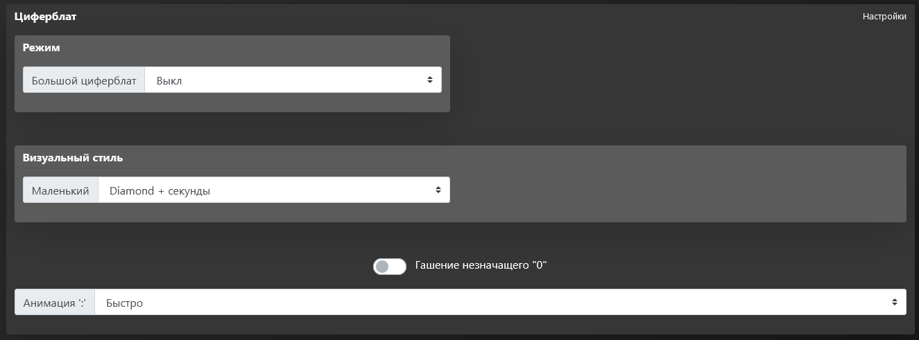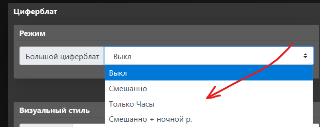 Первая настройка с выпадающим списком включает или выключает большой циферблат (только для 2-этажного режима)