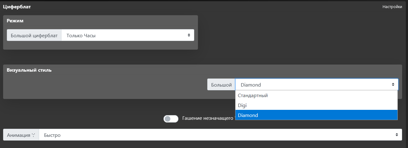 Настроить можно дизайн (шрифт) большого циферблата в списке "Большой" , на выбор имеется 3 циферблата: Обычный, DIGI, Diamond.